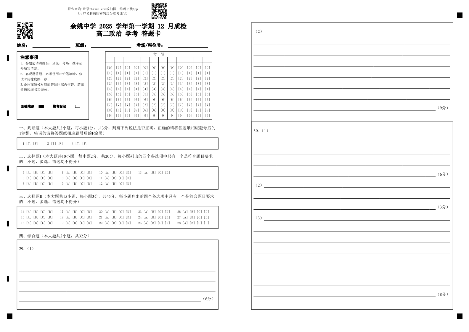 余姚中学2025学年第一学期12月质量检测 高二政治答题卡.pdf