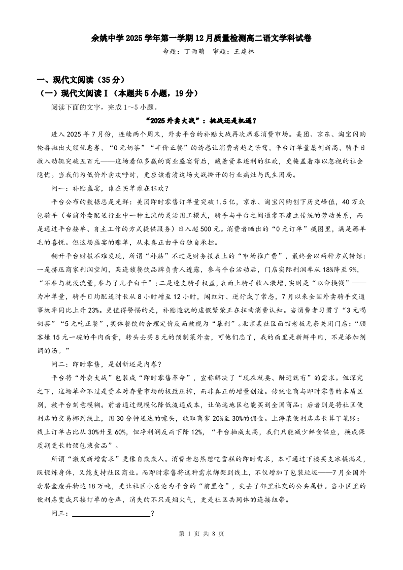 余姚中学2025学年第一学期12月质量检测 高二语文.pdf