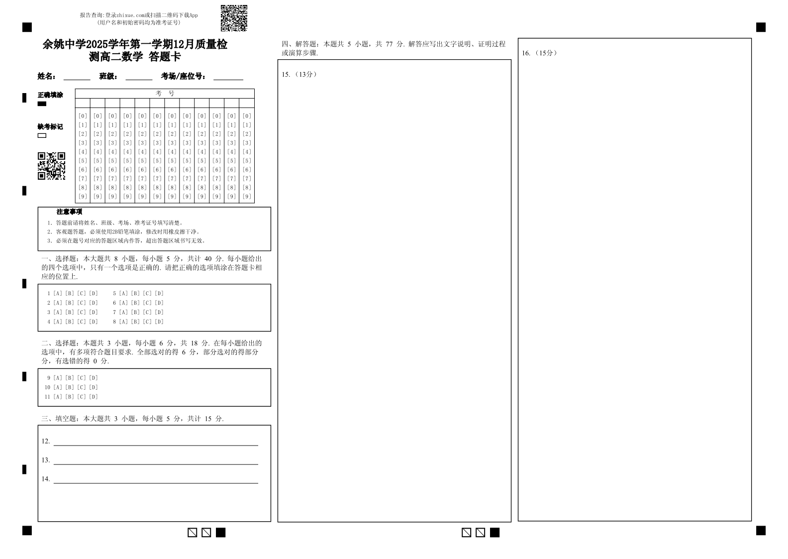 余姚中学2025学年第一学期12月质量检测 高二数学答题卡.pdf