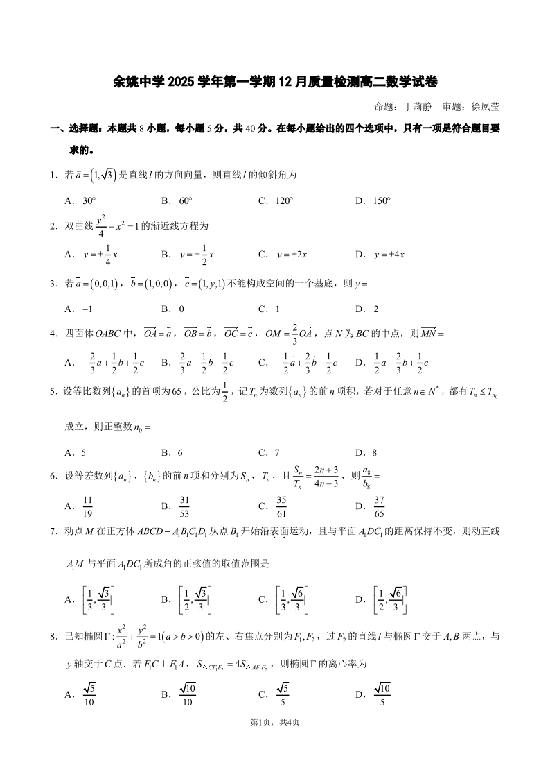 余姚中学2025学年第一学期12月质量检测 高二数学.pdf