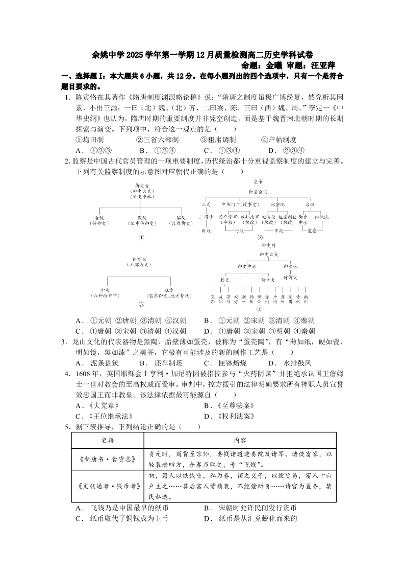 余姚中学2025学年第一学期12月质量检测 高二历史.pdf