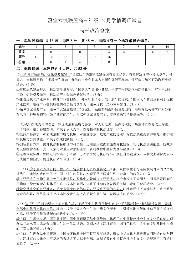 无锡市澄宜六校联盟2025-2026学年高三年级12月学情调研 政治答案.docx