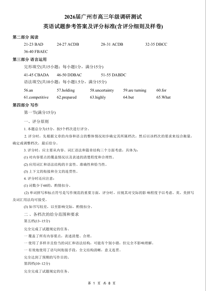 2026届广州市高三年级调研测试 英语答案.docx