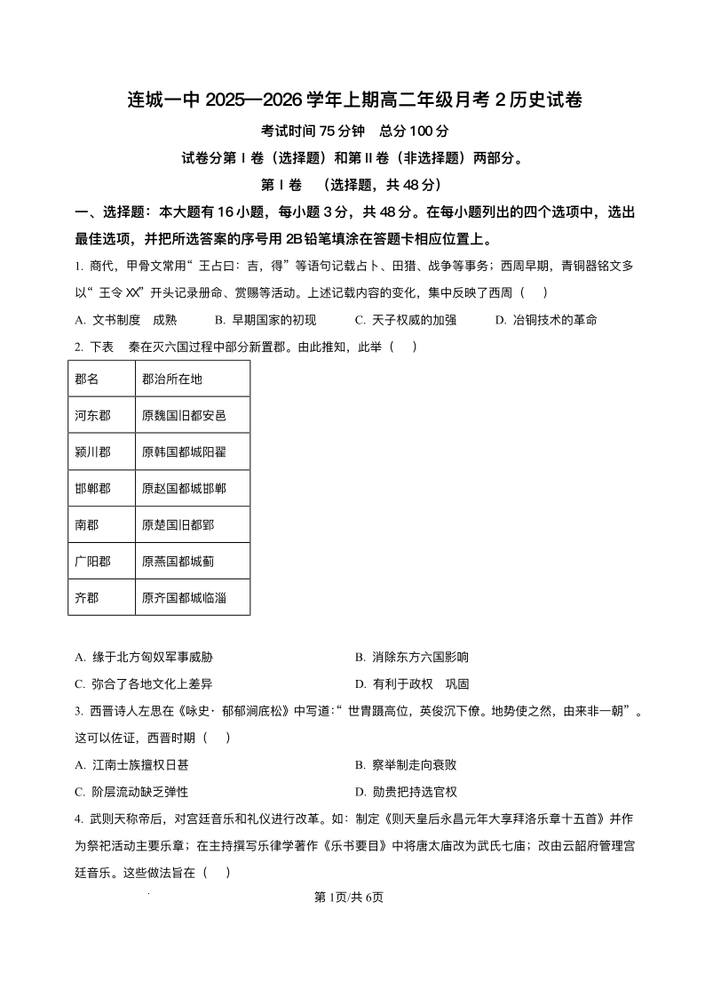 连城一中2025-2026学年上期高二年级月考2 历史试题(含答案).pdf