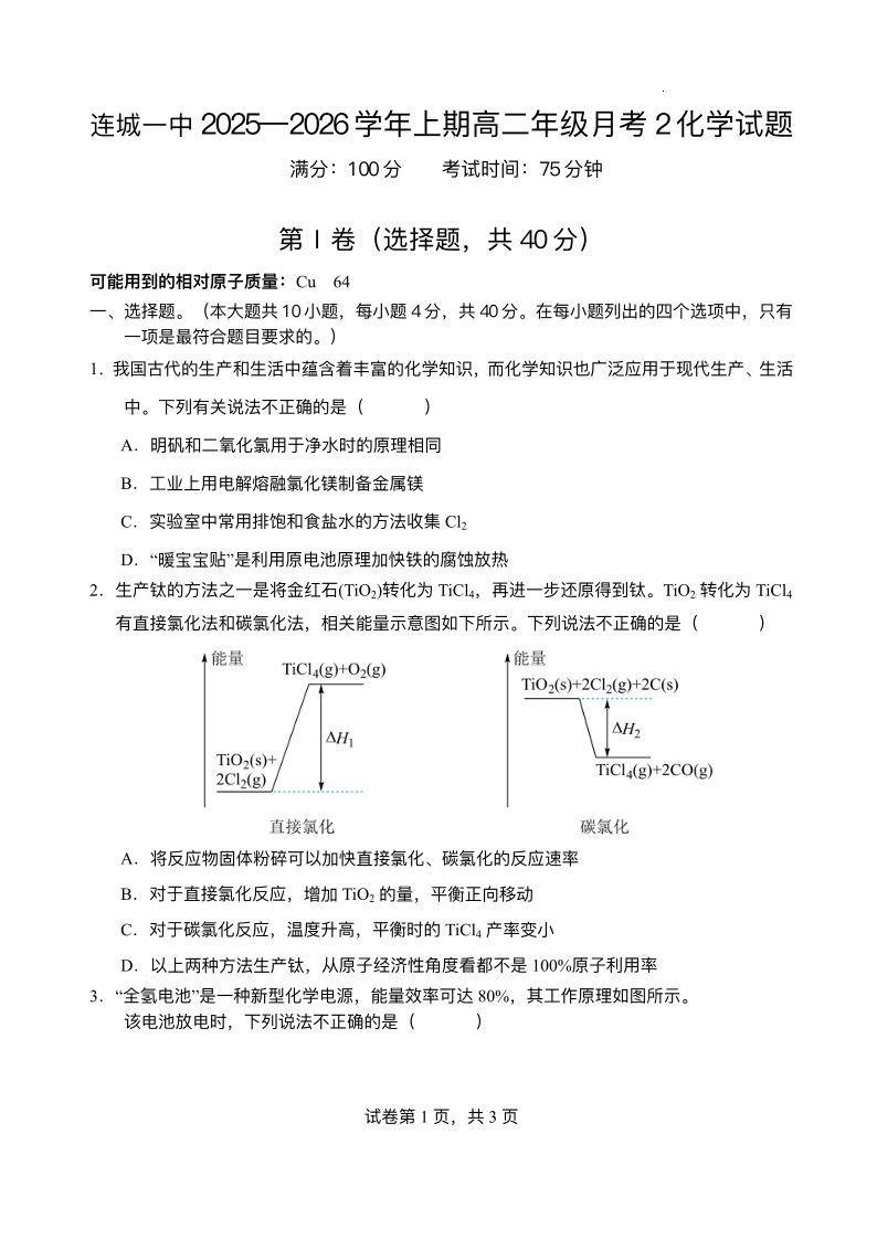 连城一中2025-2026学年上期高二年级月考2 化学试题(含答案).pdf
