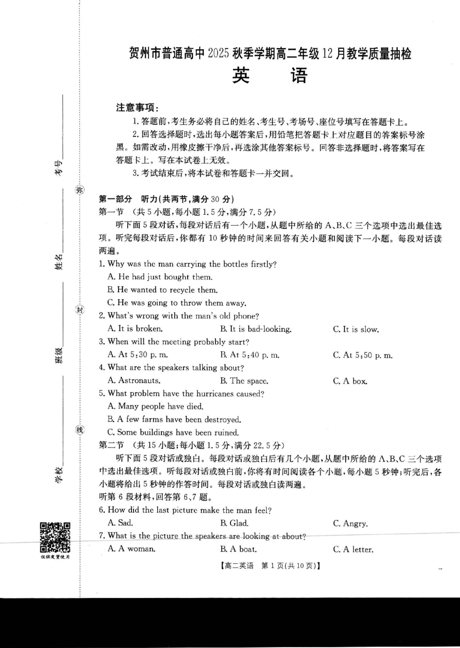 贺州市普通高中2025秋季学期高二年级12月教学质量抽检 英语.pdf