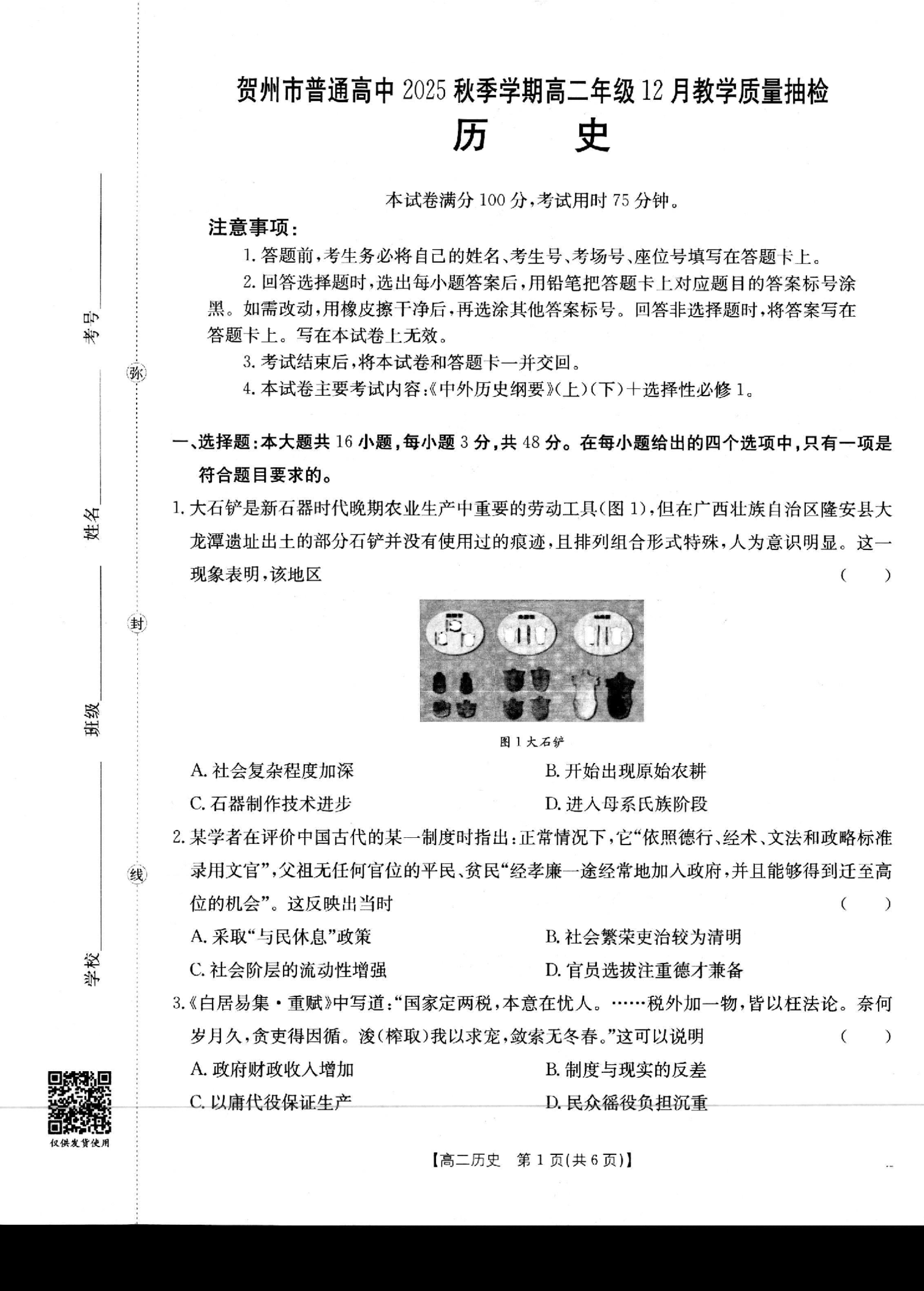 贺州市普通高中2025秋季学期高二年级12月教学质量抽检 历史.pdf