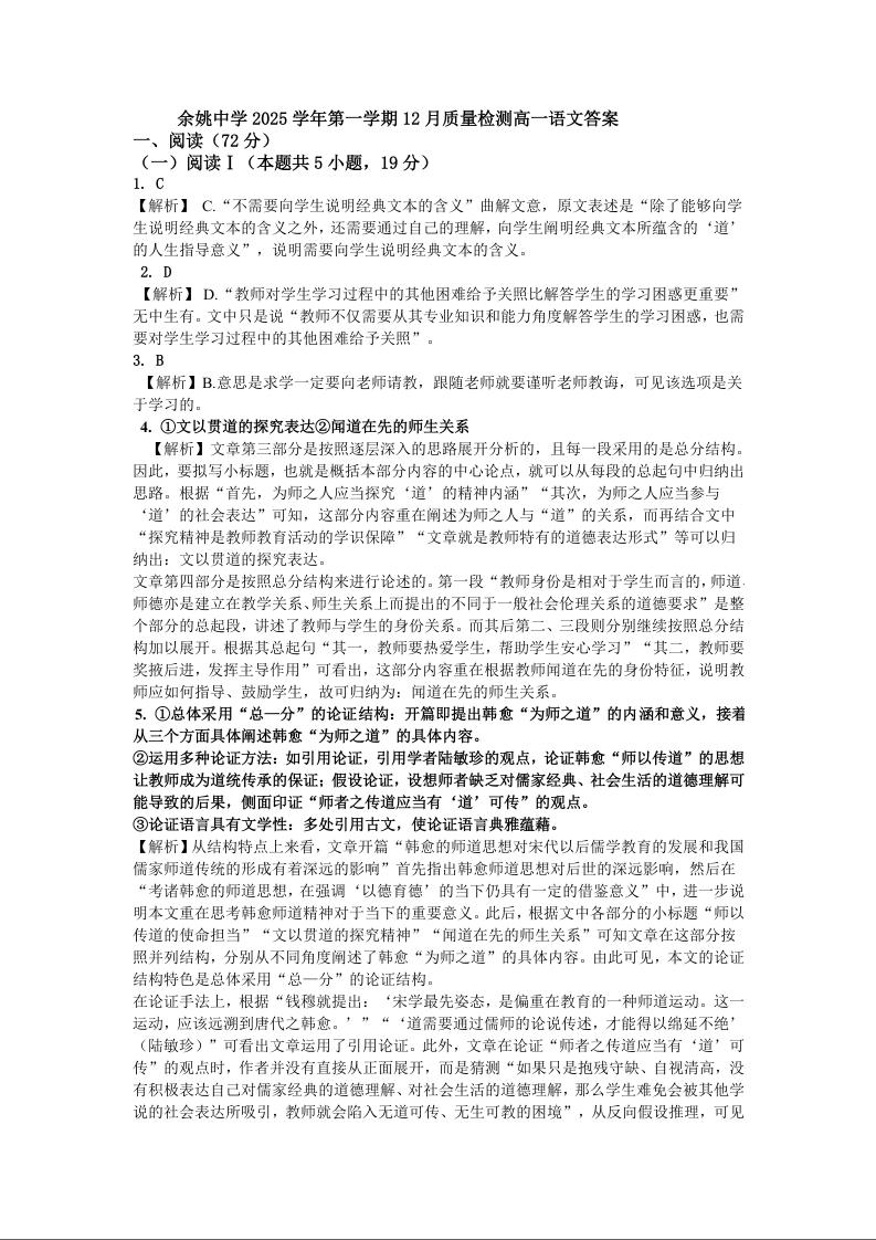 余姚中学2025学年第一学期高一年级12月质量检测 语文答案.docx