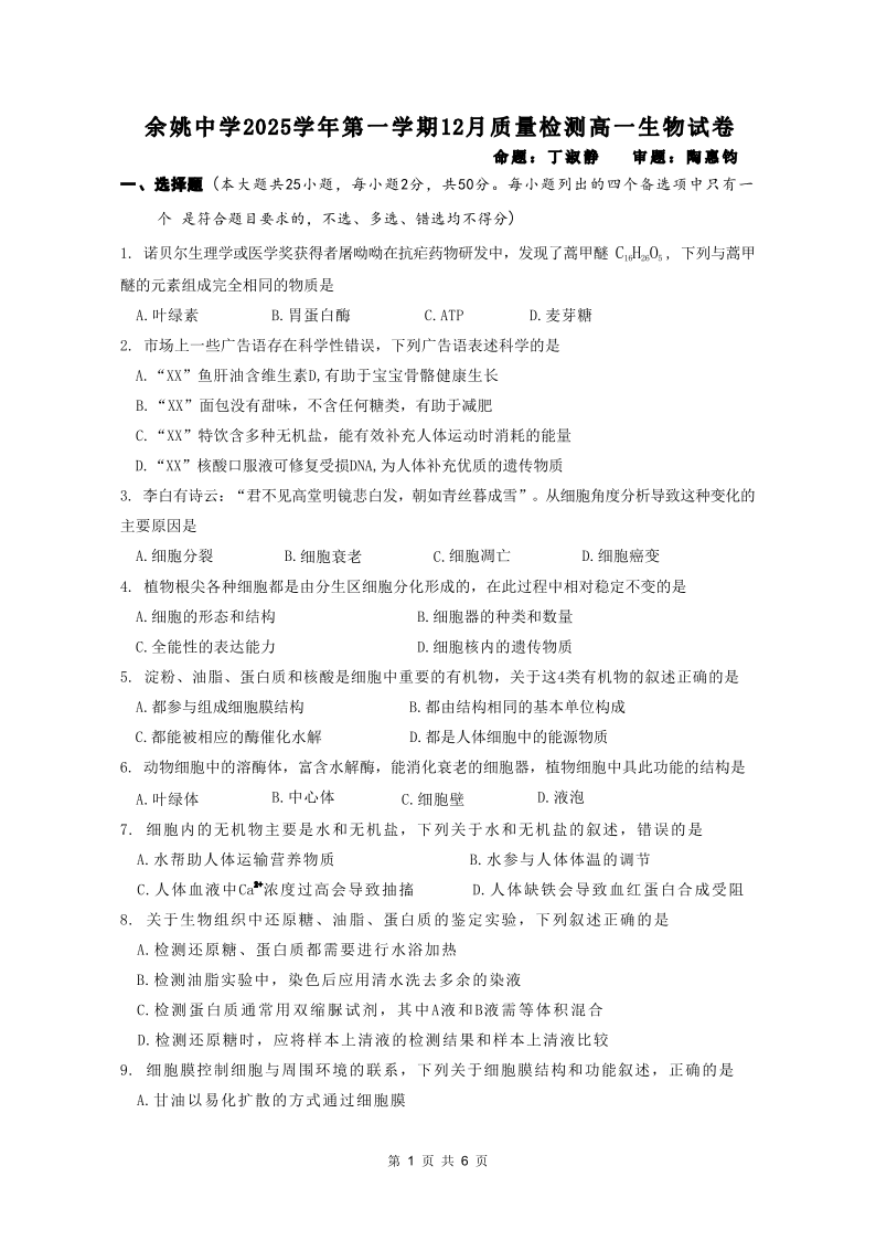 余姚中学2025学年第一学期高一年级12月质量检测 生物.pdf
