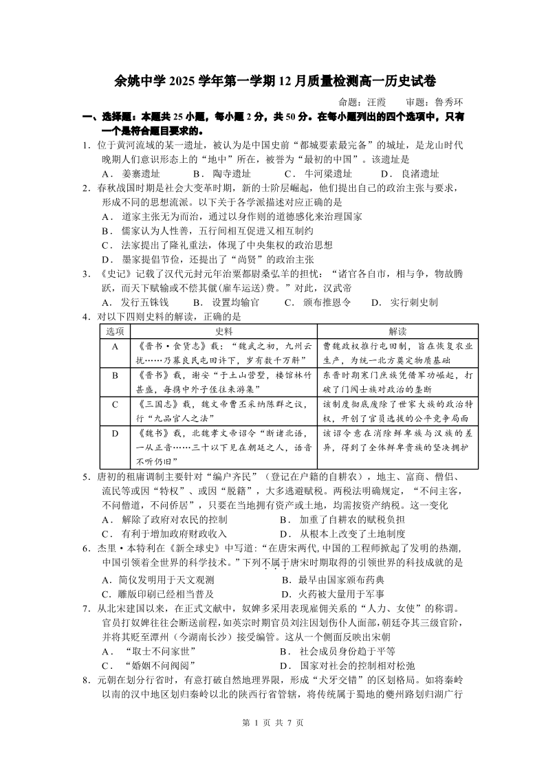 余姚中学2025学年第一学期高一年级12月质量检测 历史.pdf