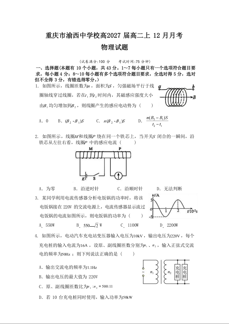 重庆市渝西中学2025-2026学年高二上学期12月月考 物理.docx