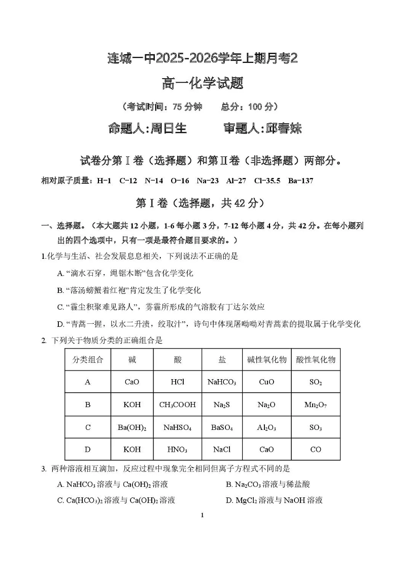 福建省连城县第一中学2025-2026学年高一上学期12月月考 化学试题(含答案).pdf