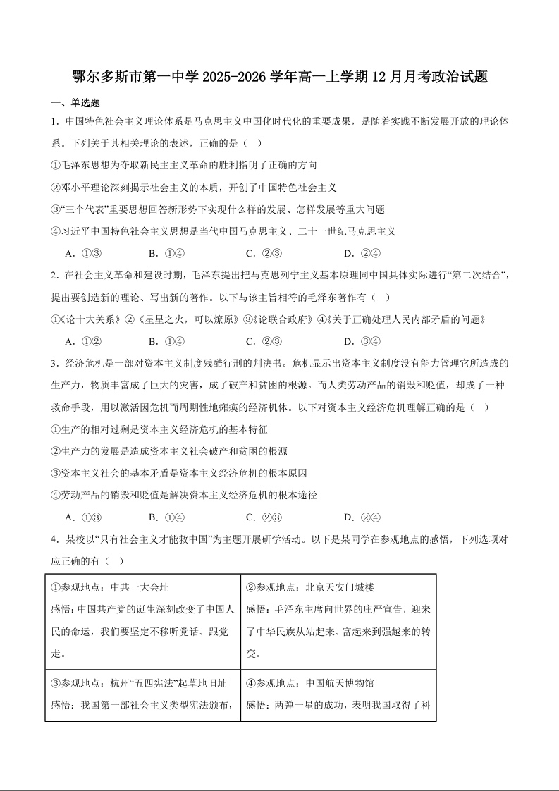内蒙古自治区鄂尔多斯市第一中学2025-2026学年高一上学期12月月考 政治.docx