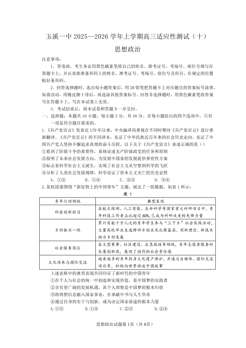 玉溪一中2025一2026学年上学期高三适应性测试(十)政治.pdf