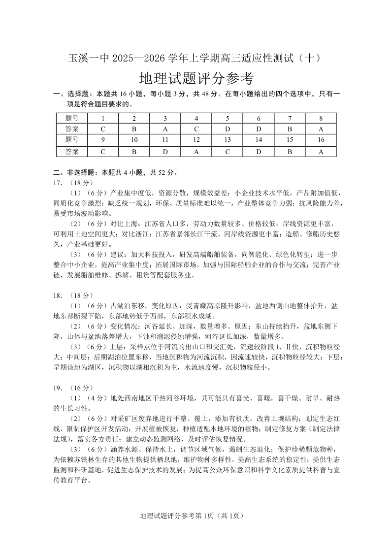 玉溪一中2025一2026学年上学期高三适应性测试(十)地理答案.pdf