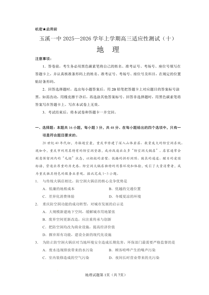 玉溪一中2025一2026学年上学期高三适应性测试(十)地理.pdf