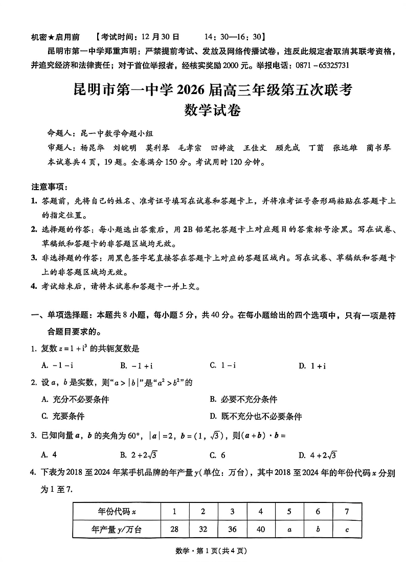 昆明市第一中学2026届高三年级第五次联考 数学试题(含答案).pdf