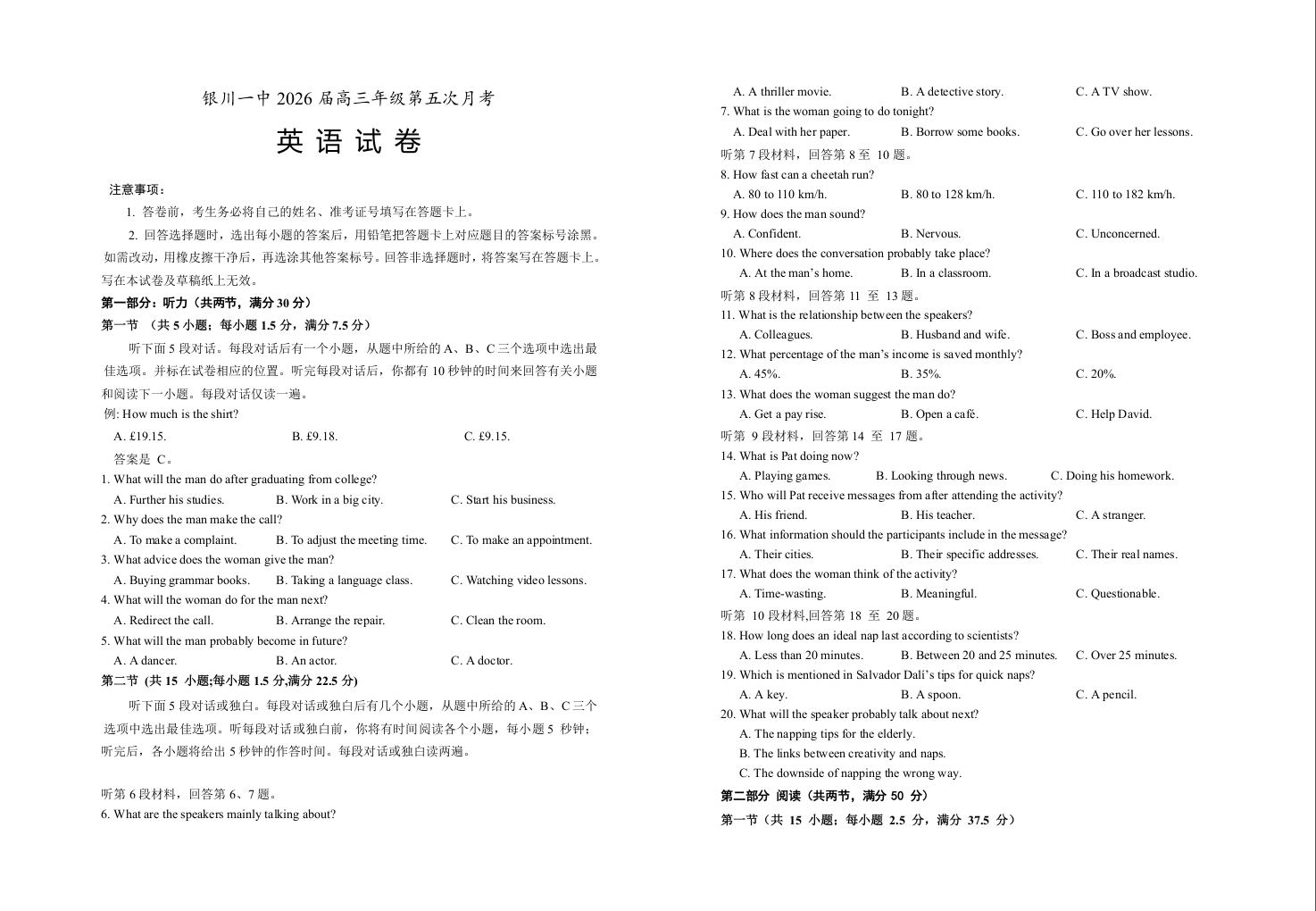 银川一中2024-2025学年高三上学期第五次月考 英语.docx