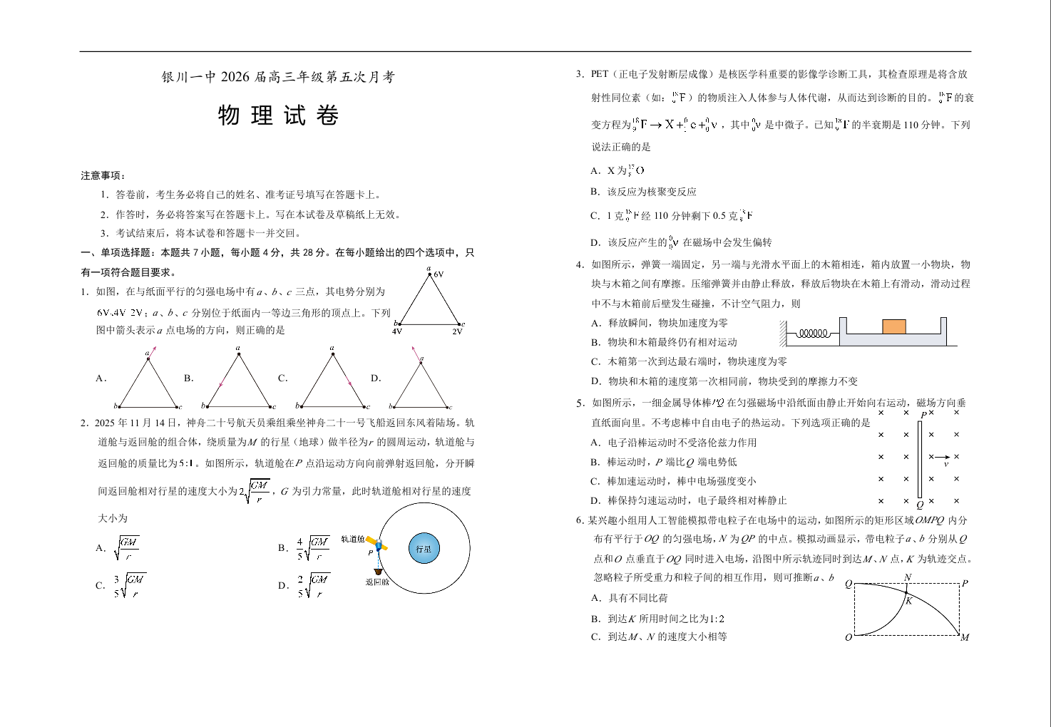 银川一中2024-2025学年高三上学期第五次月考 物理.docx