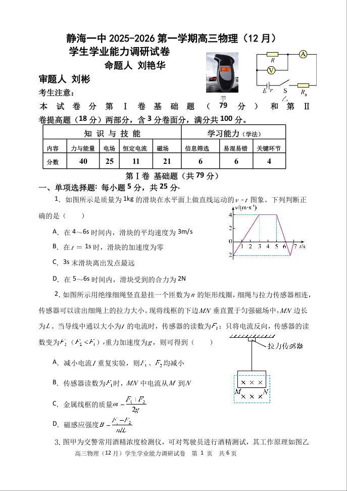 天津市静海区第一中学2026届高三上学期12月月考 物理试题(含答案).docx