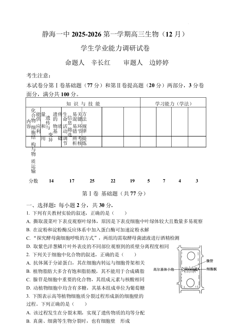 天津市静海区第一中学2026届高三上学期12月月考 生物试题(含答案).docx