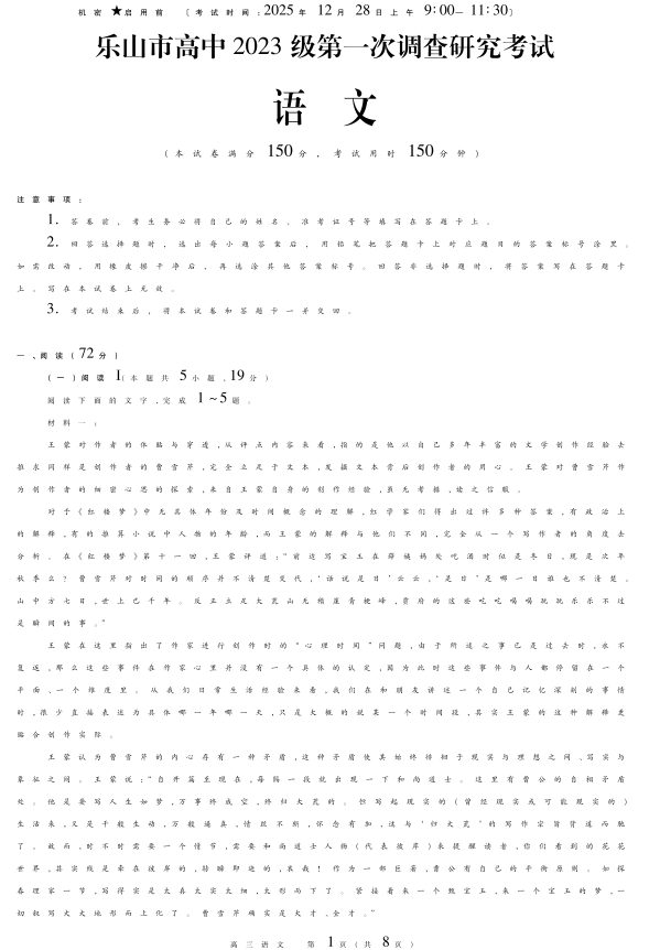 四川省乐山市高中2023级第一次调查研究考试 语文.pdf