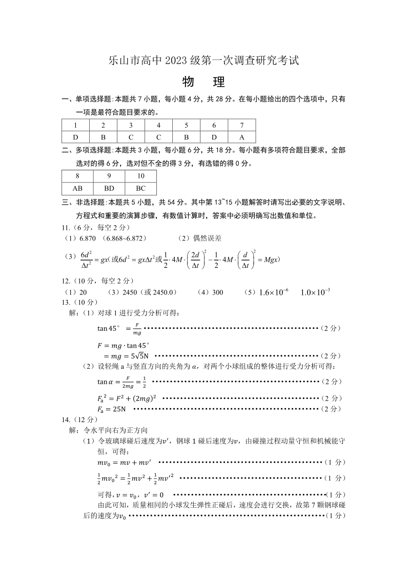 四川省乐山市高中2023级第一次调查研究考试 物理答案.pdf