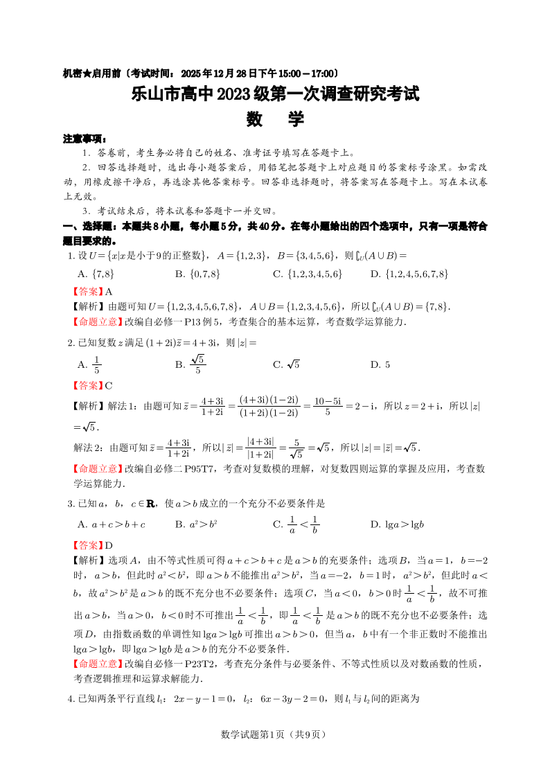 四川省乐山市高中2023级第一次调查研究考试 数学答案.pdf