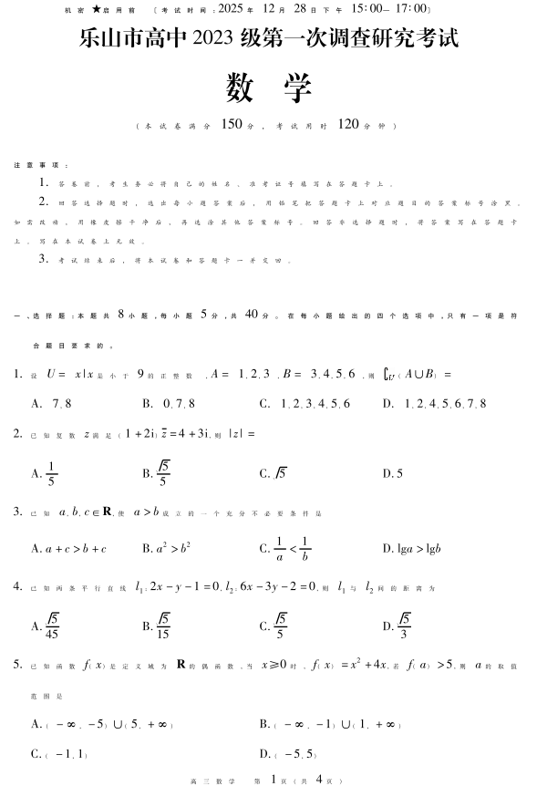 四川省乐山市高中2023级第一次调查研究考试 数学.pdf