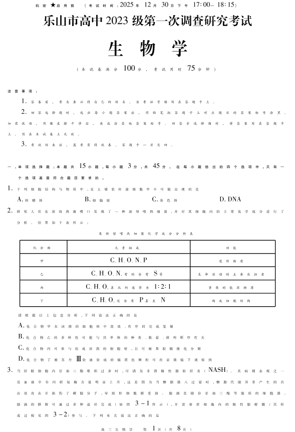 四川省乐山市高中2023级第一次调查研究考试 生物.pdf