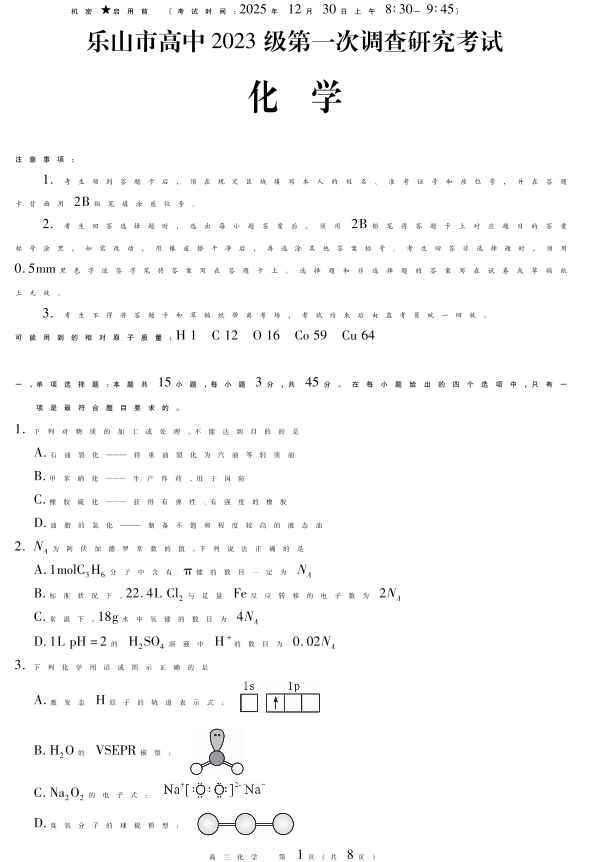 四川省乐山市高中2023级第一次调查研究考试 化学.pdf