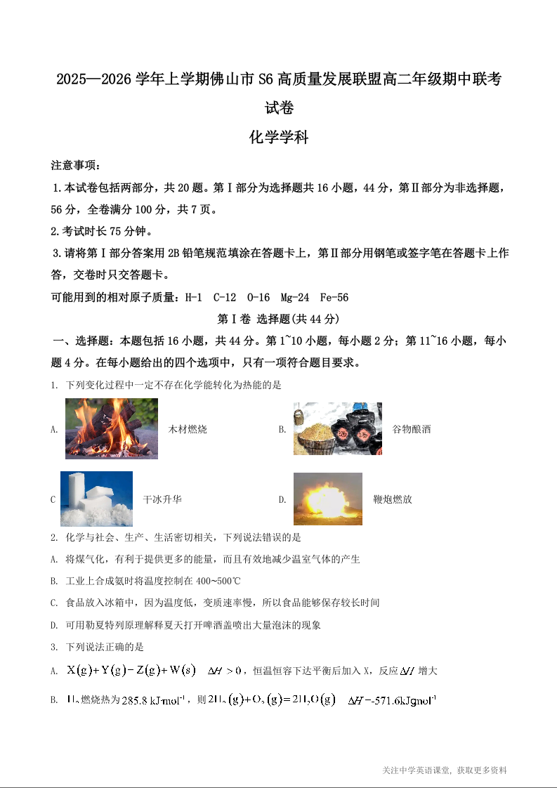 广东省佛山市S6高质量发展联盟2025-2026学年高二上学期期中联考试题 化学试题(含答案).docx