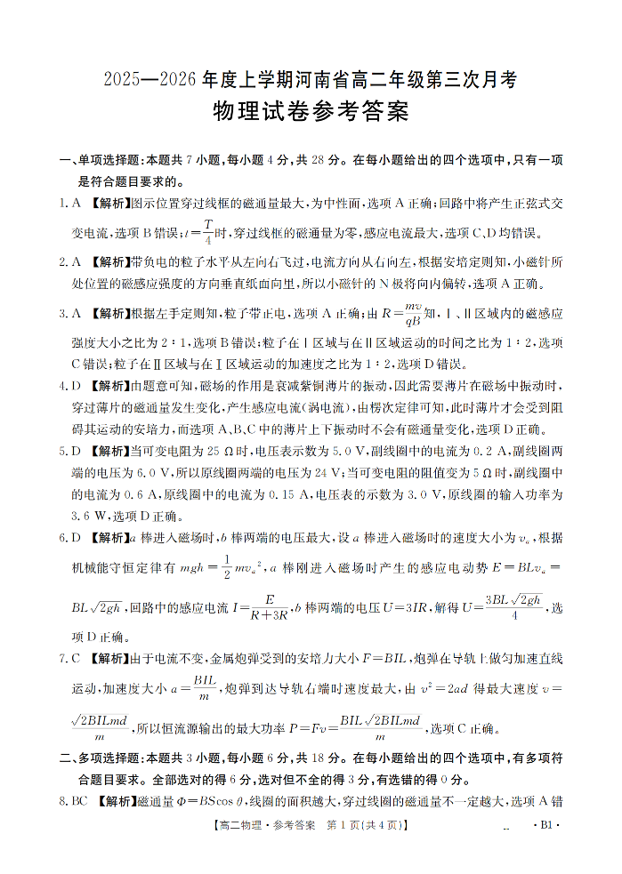 河南省2025-2026年度高二年级上学期第三次月考试卷 物理答案.pdf