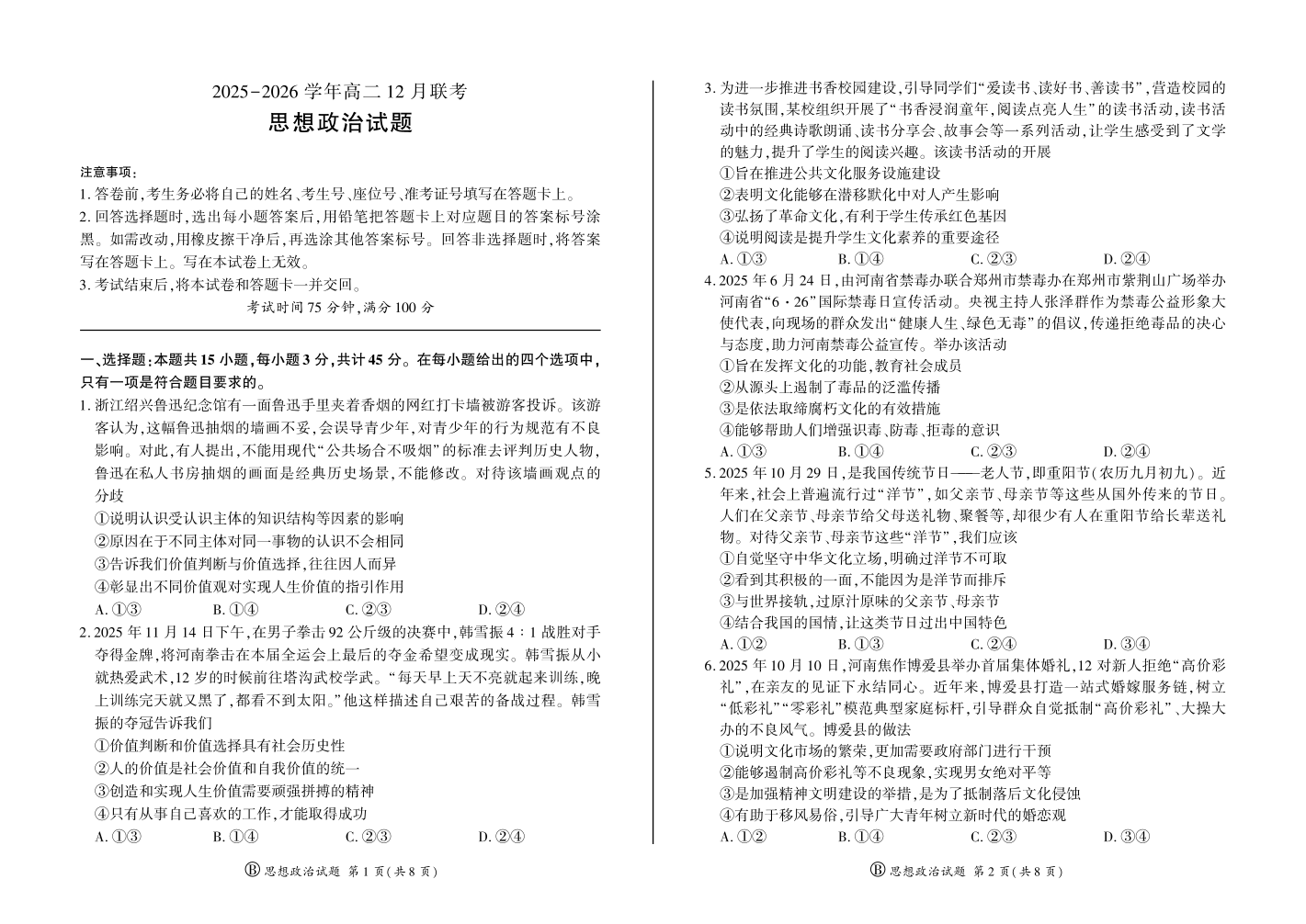 河南省百师联盟2027届高二上学期12月联考 政治(B卷).pdf