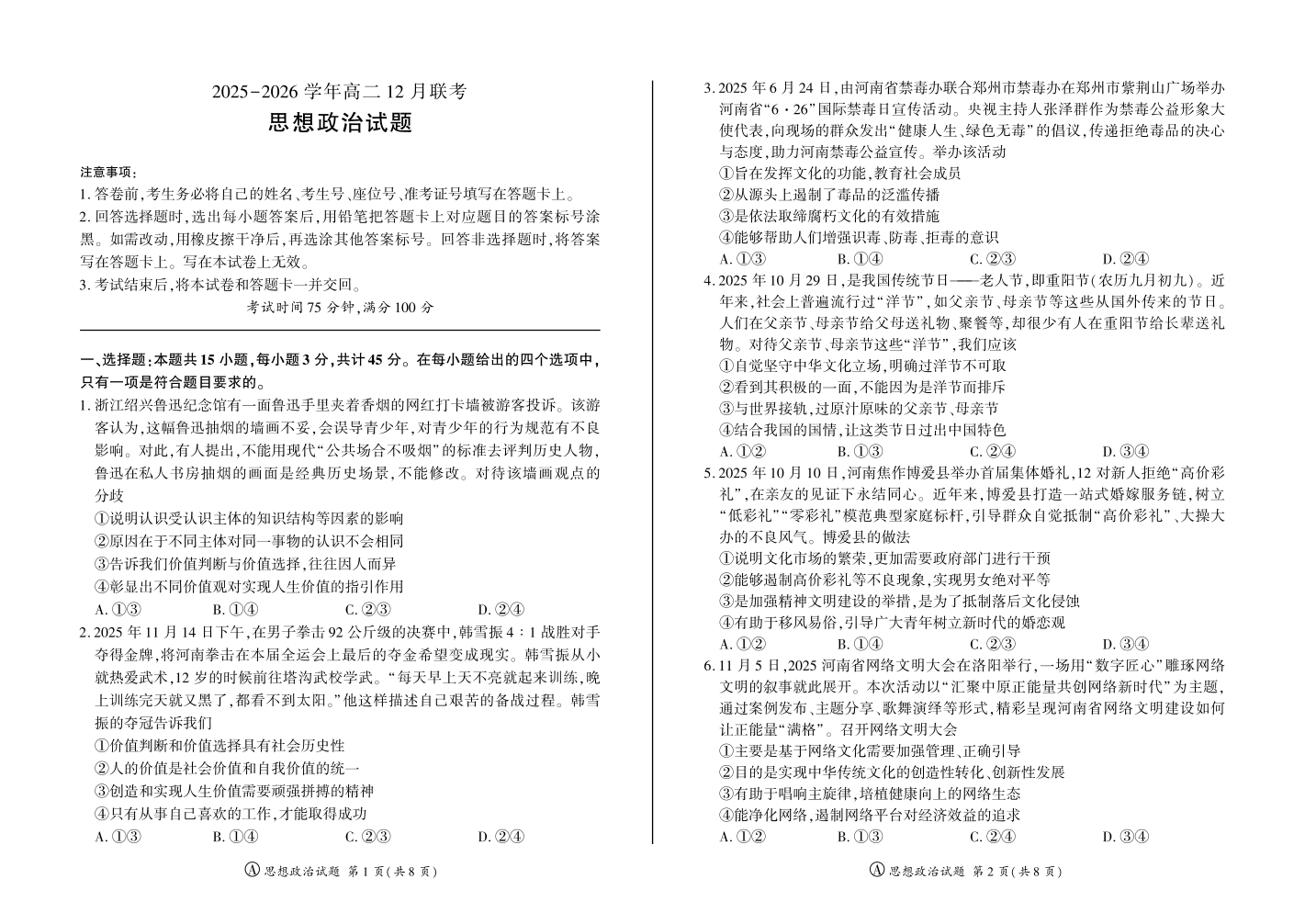 河南省百师联盟2027届高二上学期12月联考 政治(A卷).pdf