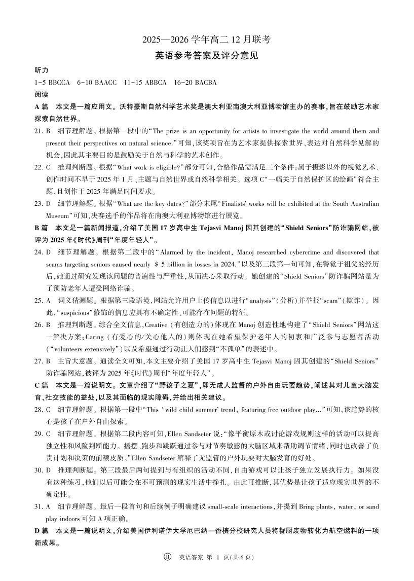 河南省百师联盟2027届高二上学期12月联考 英语(B卷)答案.pdf