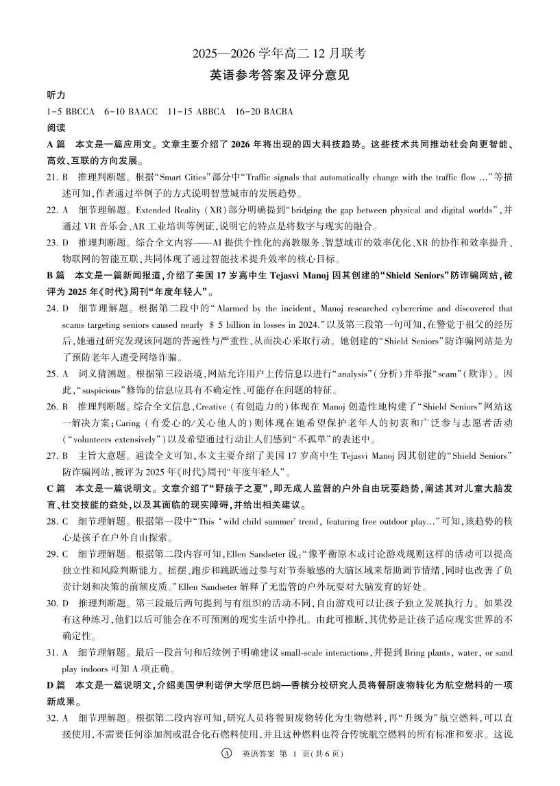 河南省百师联盟2027届高二上学期12月联考 英语(A卷)答案.pdf