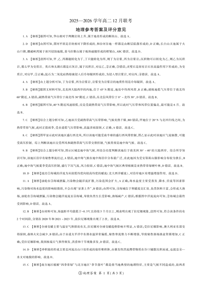 河南省百师联盟2027届高二上学期12月联考 地理(A卷)答案.pdf
