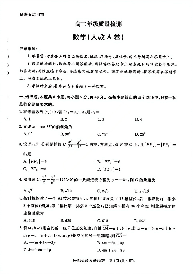 河南省青桐鸣大联考2026年高二年级上学期1月质量检测 数学(人教版A版).pdf