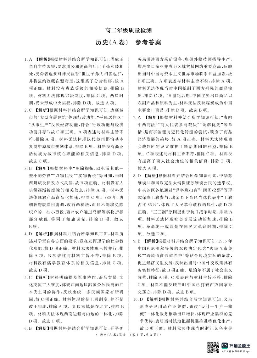 河南省青桐鸣大联考2026年高二年级上学期1月质量检测 历史(A卷)答案.pdf