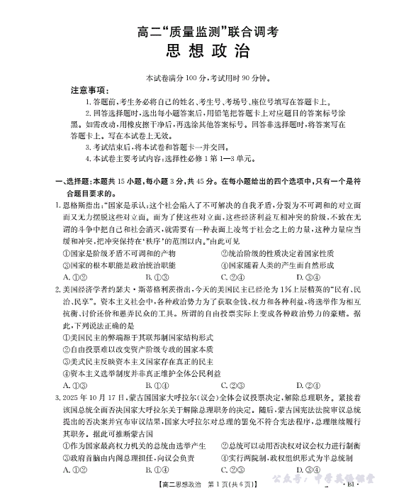 山东省2025-2026学年高二上学期“质量监测”联合调考 政治.pdf