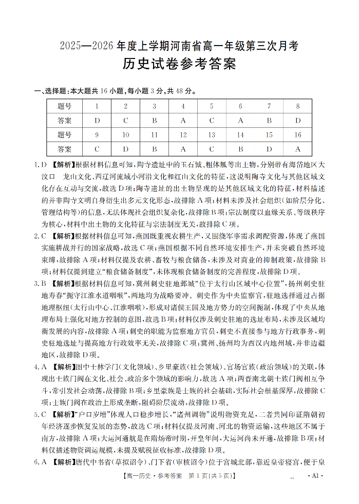 河南省2025-2026年度高一年级上学期第三次月考试卷 历史答案.pdf