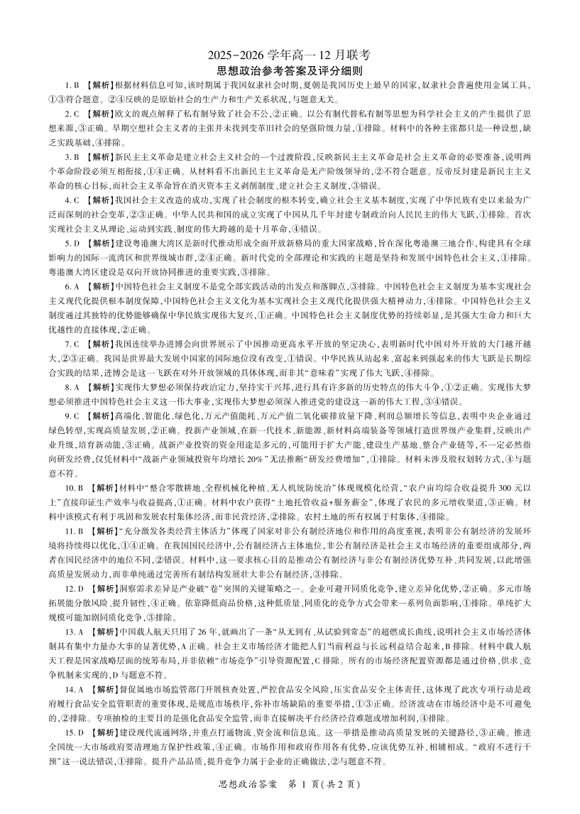 河南省百师联盟2028届高一上学期12月联考 政治答案.pdf