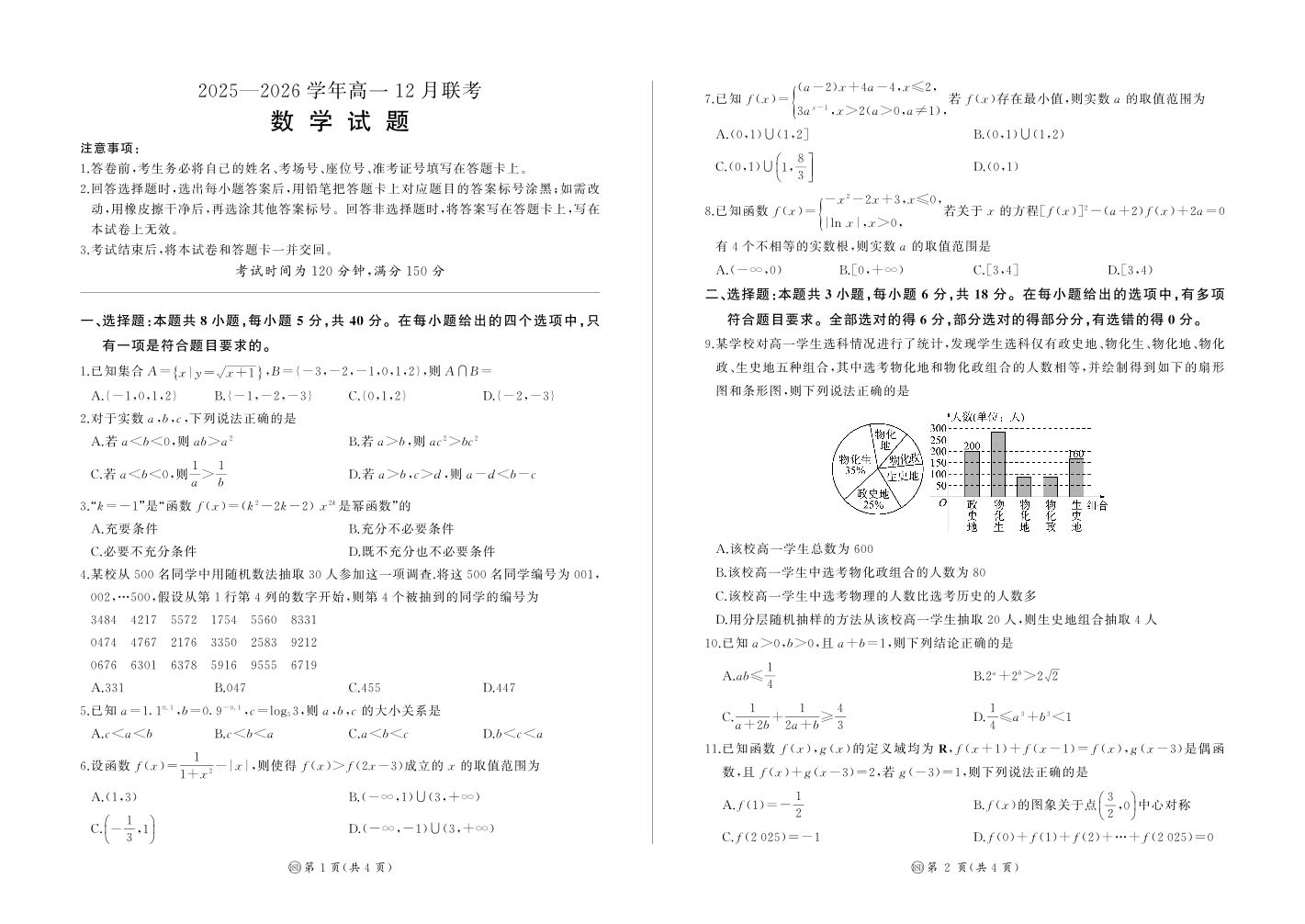 河南省百师联盟2028届高一上学期12月联考 数学(BSD).pdf