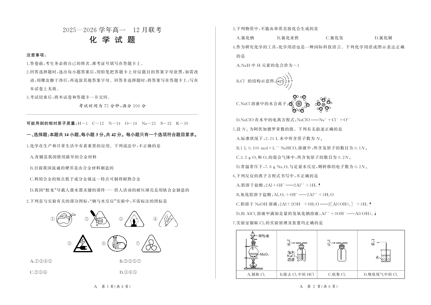 河南省百师联盟2028届高一上学期12月联考 化学(A).pdf