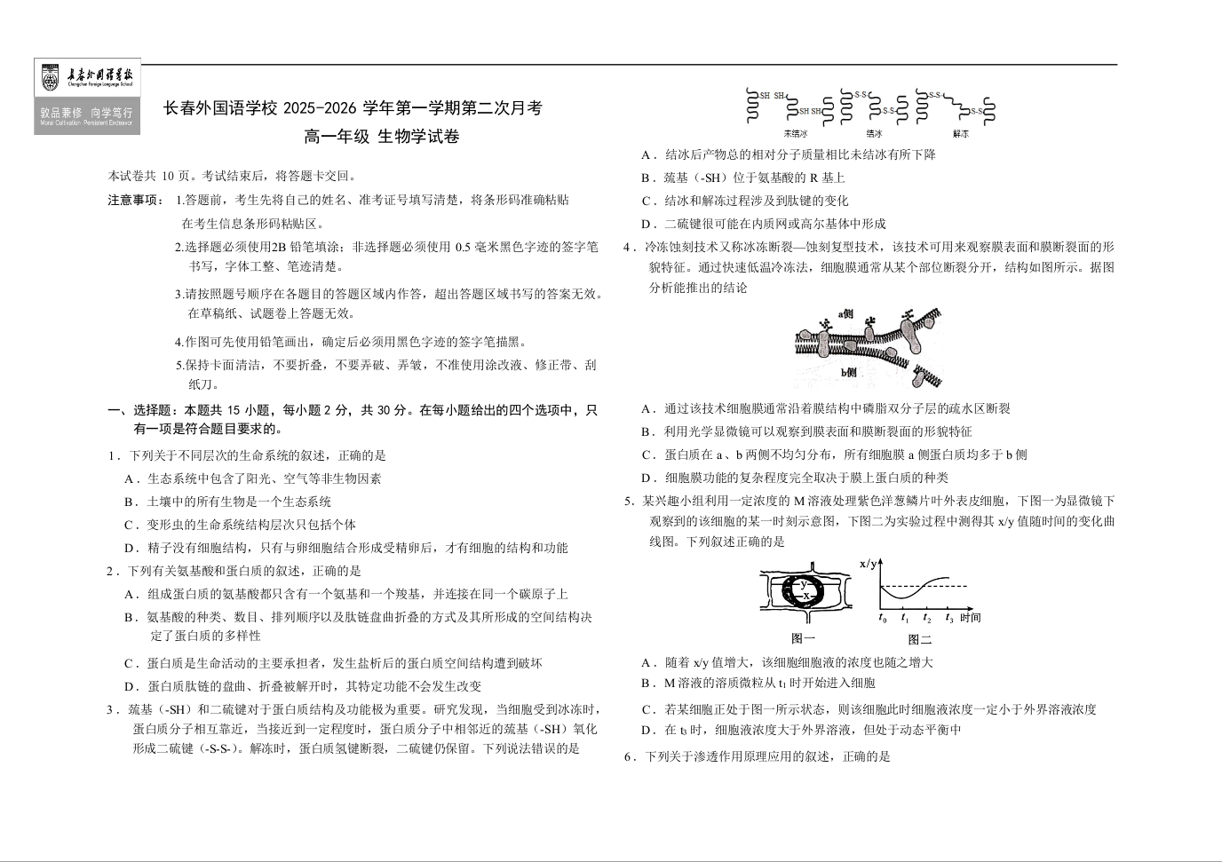 长春外国语学校2025-2026学年第一学期高一年级第二次月考 生物试题(含答案).docx