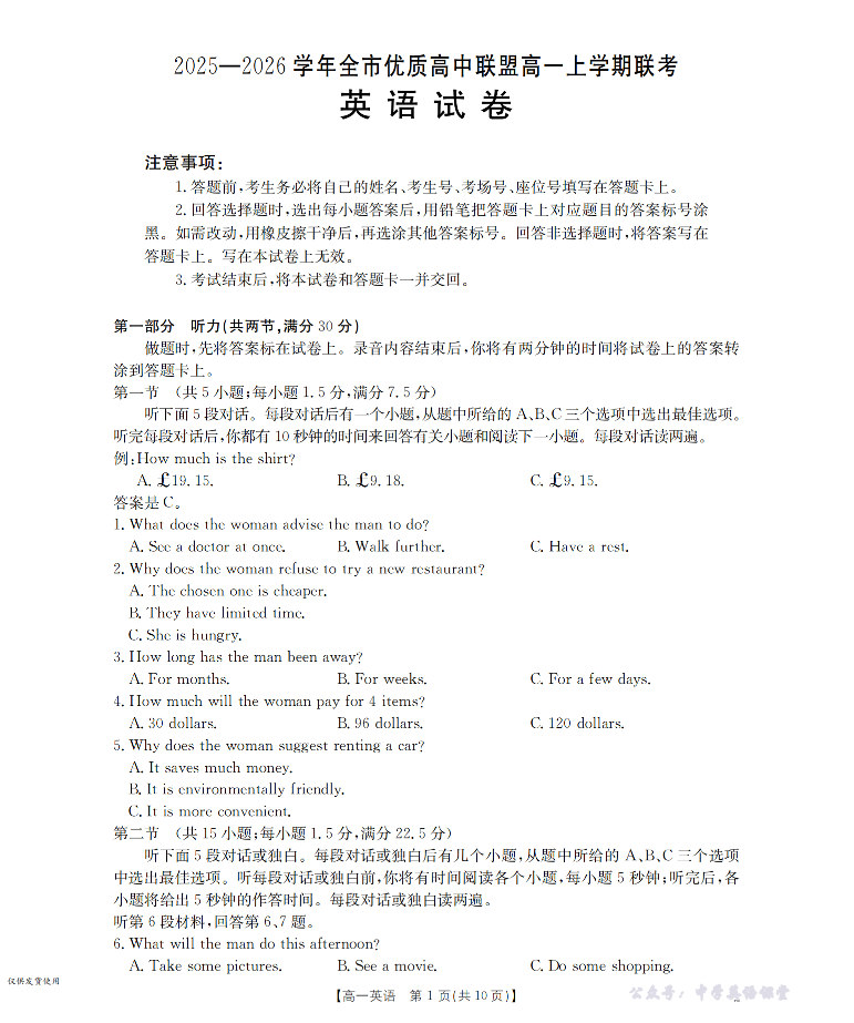 内蒙古赤峰市2025-2026学年全市优质高中联盟高一上学期联考 英语.pdf