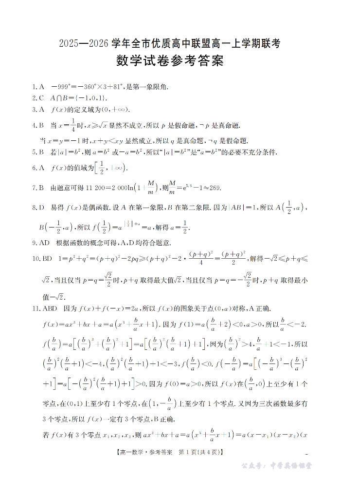 内蒙古赤峰市2025-2026学年全市优质高中联盟高一上学期联考 数学答案.pdf