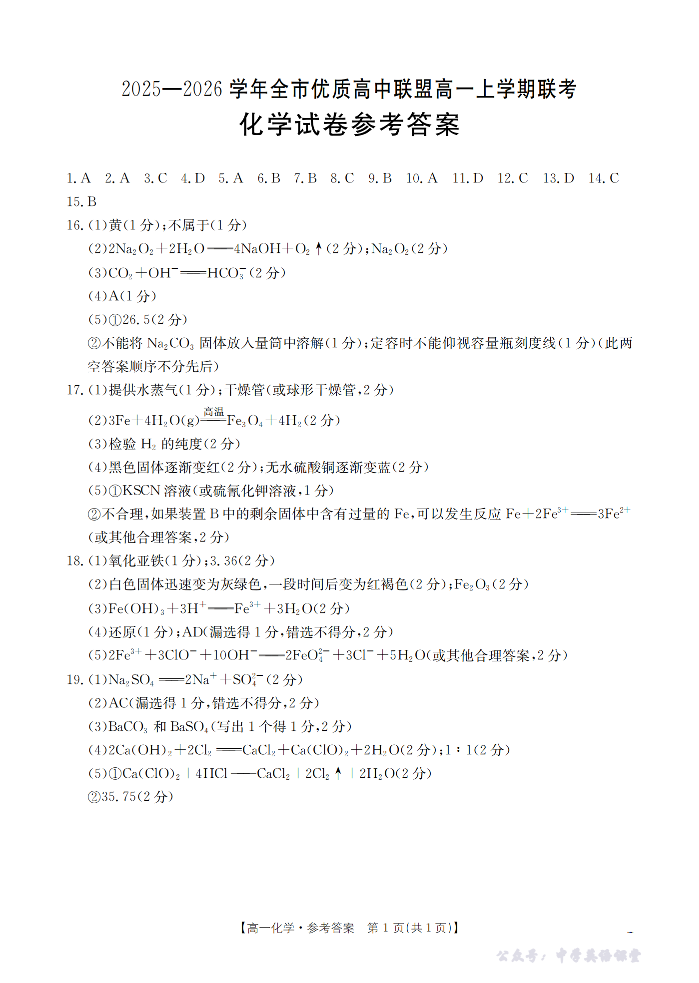 内蒙古赤峰市2025-2026学年全市优质高中联盟高一上学期联考 化学答案.pdf