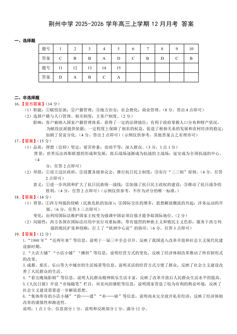 湖北省荆州中学2025-2026学年高三上学期12月月考 历史答案.docx